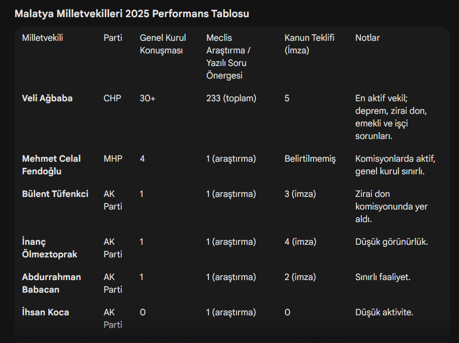 Tabloya bakıldığında en dikkat çeken detay, Veli Ağbaba’nın 71 Genel Kurul Konuşması ve tam 338 Komisyon Konuşması ile rakiplerine devasa bir fark atmış olmasıdır. Ağbaba’nın 24 soru önergesi, 7 kanun teklifi ve 12 meclis araştırma önergesiyle sürdürdüğü aktif siyaset; Malatya halkının sesini Ankara’nın en yüksek mercilerinde yankılatma konusundaki kararlılığını simgeliyor.